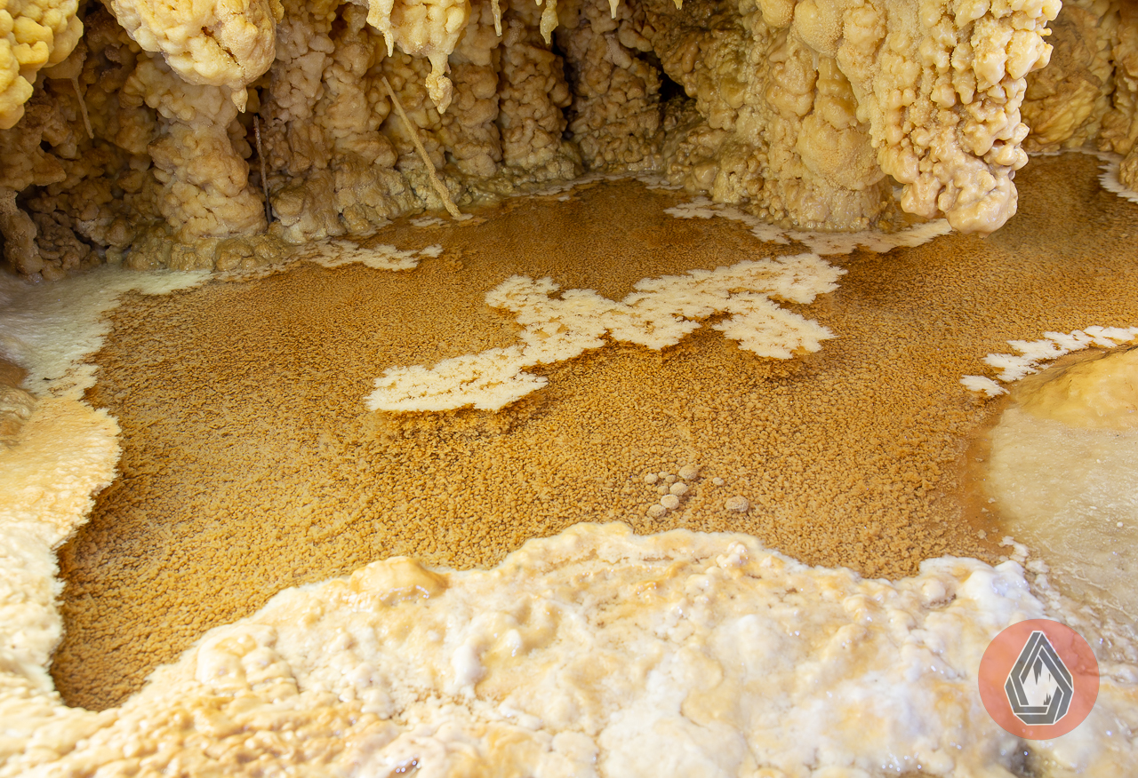 După Sala Mendip peștera parcă este o alta: septele din podea se transformă în pat gros de nisip, vâltorile se transformă în galerii cu apă liniștite – da ! apa este încă mare, până la genunchi, dar curge liniștit. Pereții sunt negri și poți observa cu ușurință minunile albe de calcit suspedate din când în când deasupra ta, la metri distanță. Reîncep pragurile și micile cascade, cățărăm din nou ba în spraiț, ba agățați cu totul de peretele plin de lingurițe și ajungem în jumătate de ora la Sifonul Verde. Aici o cascadă de baldachine obtureaza galeria principală și urcă până sus în dreapta spre Sifonul Verde – un adevărat ochi de smarald și în stânga spre Sălița Supendata. Urcăm întâi în săliță și Mihai ne arată cu multă emoție locurile unde făceau ei bivuac – borcanul de miere îngropat pe jumătate în răul împietrit de calcit, bolovanii de care agățau hamace, patul de nisip unde se gospodareau și altele. După ce vizităm si sifonul, descațarăm cu grijă până la nivelul activului principal și revenim în sala Mendip de unde, tot împărțiți în două echipe ne îndreptăm spre ieșire.